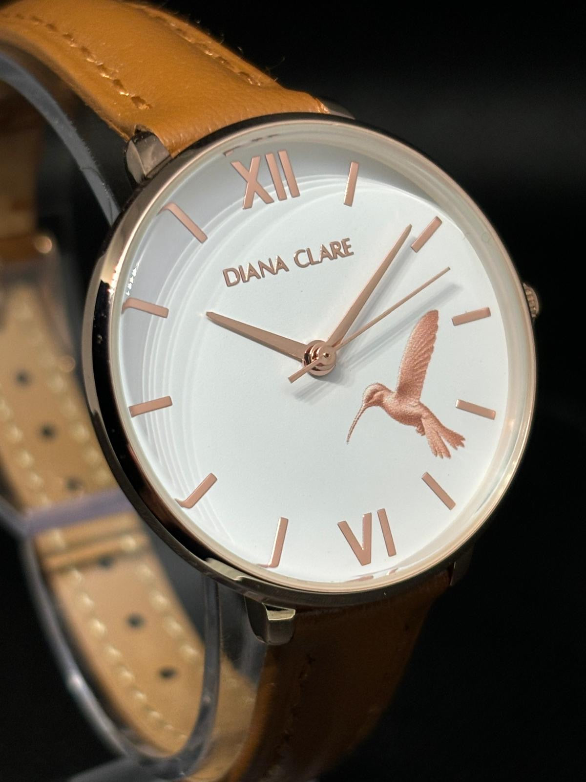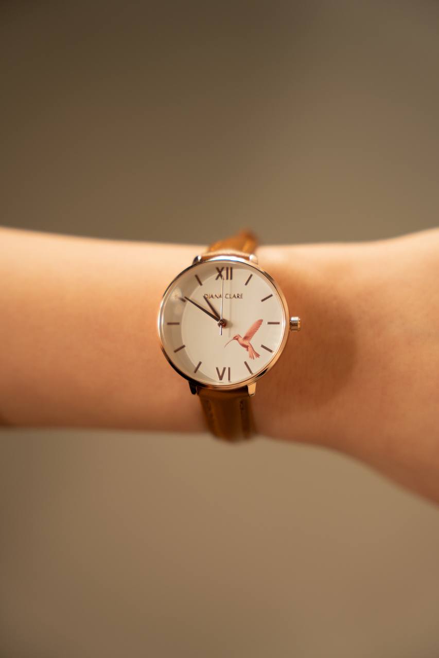 Encased in a 32mm rose gold casing and strapped with 12mm genuine leather straps, the first classy Hummingbird watch is fashioned in white with brown straps!